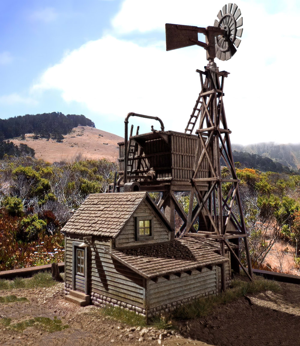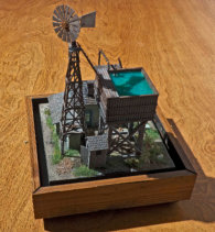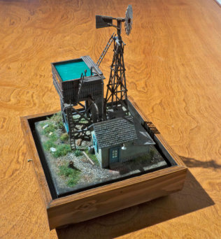 The Pumping Station This 9” X 9” diorama is 1:87 scale or approximately ⅛” = 1 foot. So, a human figure is about ¾”  After photographing them some were superimposed over background images of sky or terrain Click to enlarge and image and use your arrow keys < > to cycle through