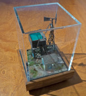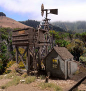 The Pumping Station This 9” X 9” diorama is 1:87 scale or approximately ⅛” = 1 foot. So, a human figure is about ¾”  After photographing them some were superimposed over background images of sky or terrain Click to enlarge and image and use your arrow keys < > to cycle through Made with Xara Back to Top of Page